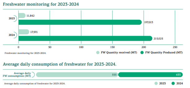 All vessels in our fleet are self-sufficient in freshwater production, equipped with onboard Fresh Water Generators (FWGs) that use engine heat to distill seawater into freshwater. As a result, the majority of freshwater consumed onboard is produced internally, significantly minimizing reliance on external water supplies. Any necessary replenishment is mainly conducted in ports located outside water-stressed areas, ensuring minimal impact on local communities and ecosystems.